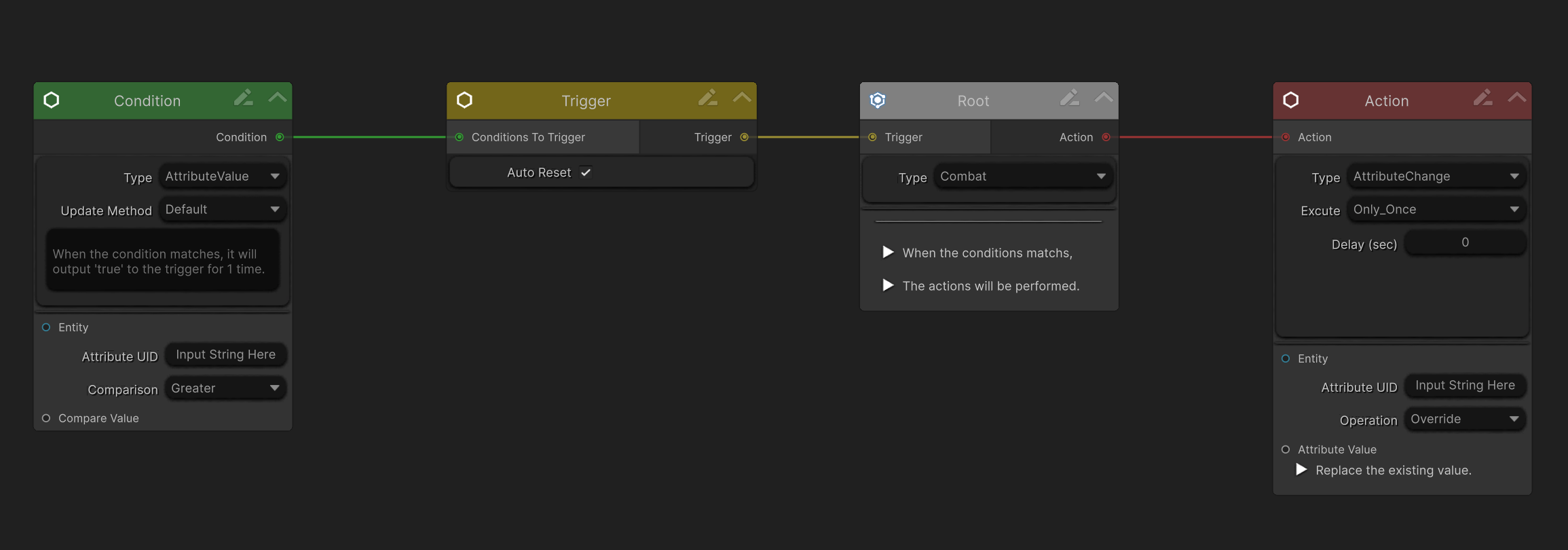 If the condition is True, the Root Node will execute all connected Action Nodes.
