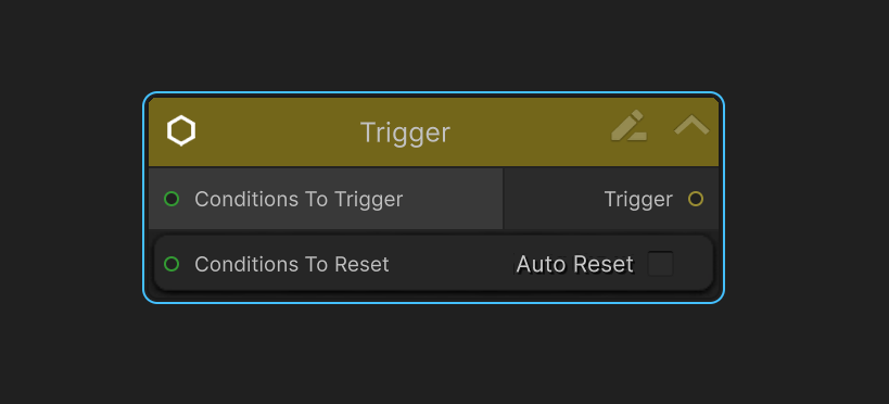Trigger Nodes are stateful gate nodes used to control when a graph is allowed to execute. They evaluate connected condition nodes and cache their result until explicitly reset.