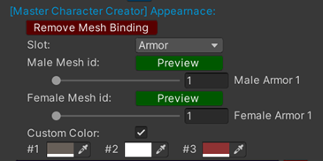 Custom Color: Toggle this checkbox to customize the colors of the mesh, allowing you to have multiple equipment items with different colors using the same mesh.