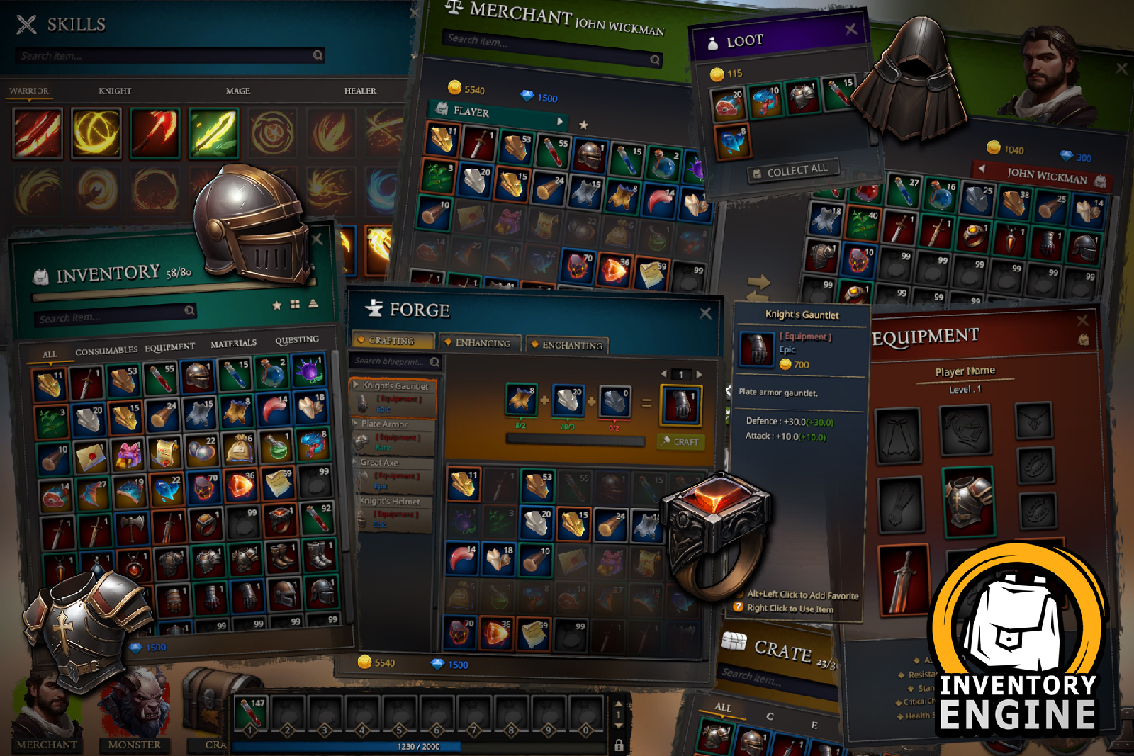 Allow players to craft powerful items, enhance them to new heights, socketing gems to the equipments and add unique Enchantment —all fully customizable within the Unity Editor.